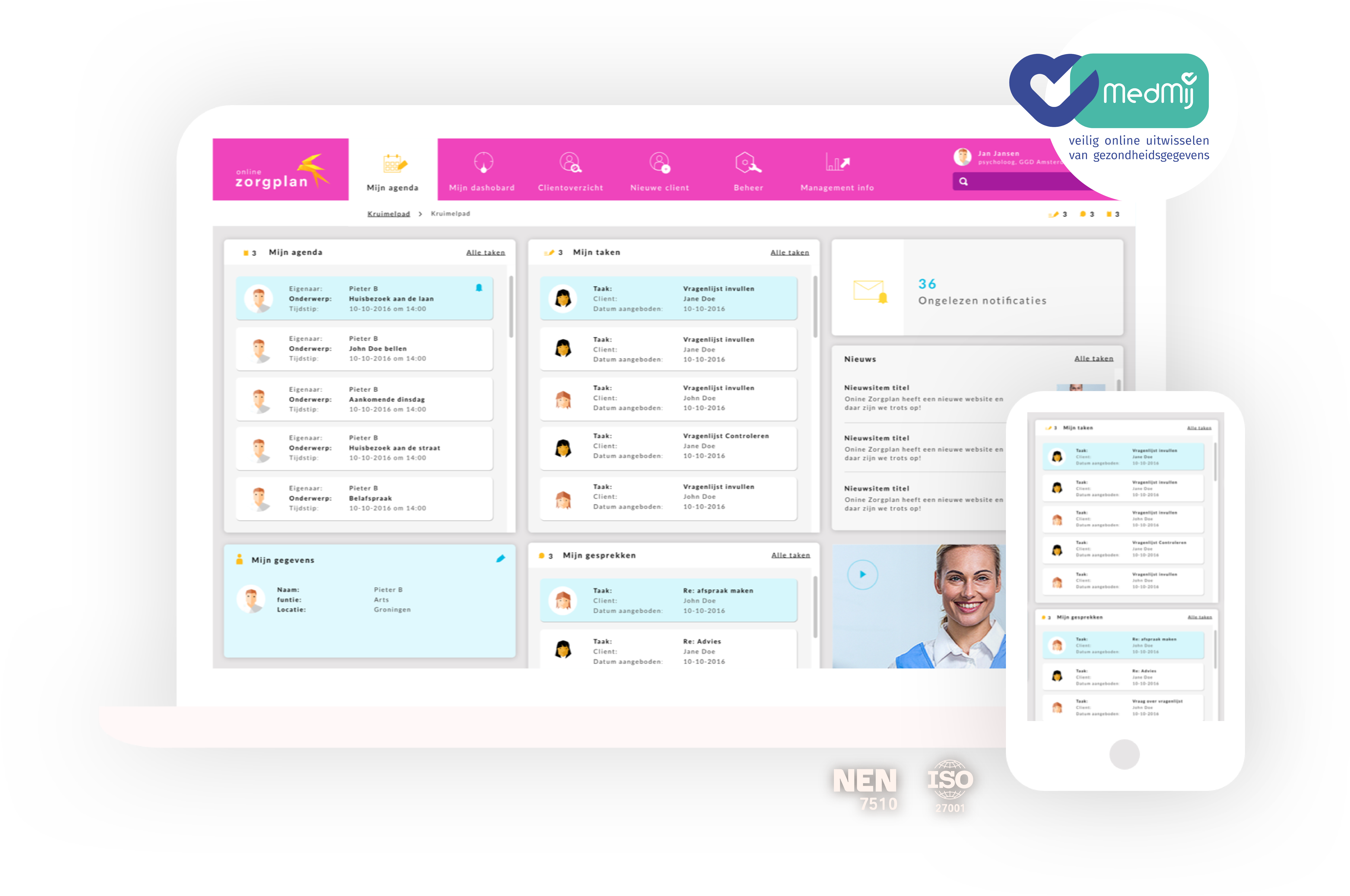 De zorgverlener en cliënt beschikken over een agenda in Online Zorgplan. Met de agenda kan de zorgverlener afspraken inplannen met de cliënt die op het dashboard van de cliënt en zorgverlener staan gepresenteerd. Zowel cliënt als zorgverlener ontvangen een herinnering voorafgaand aan de geplande afspraak.
